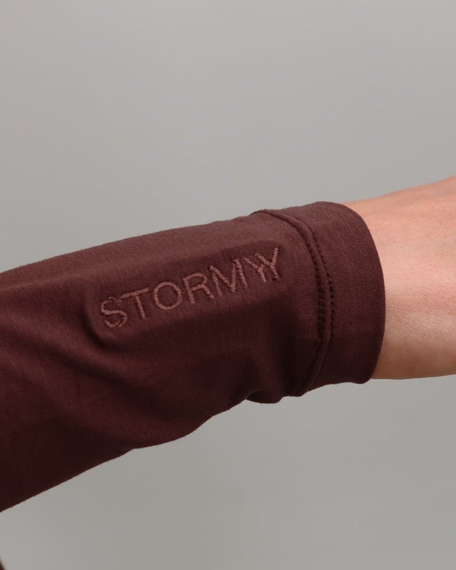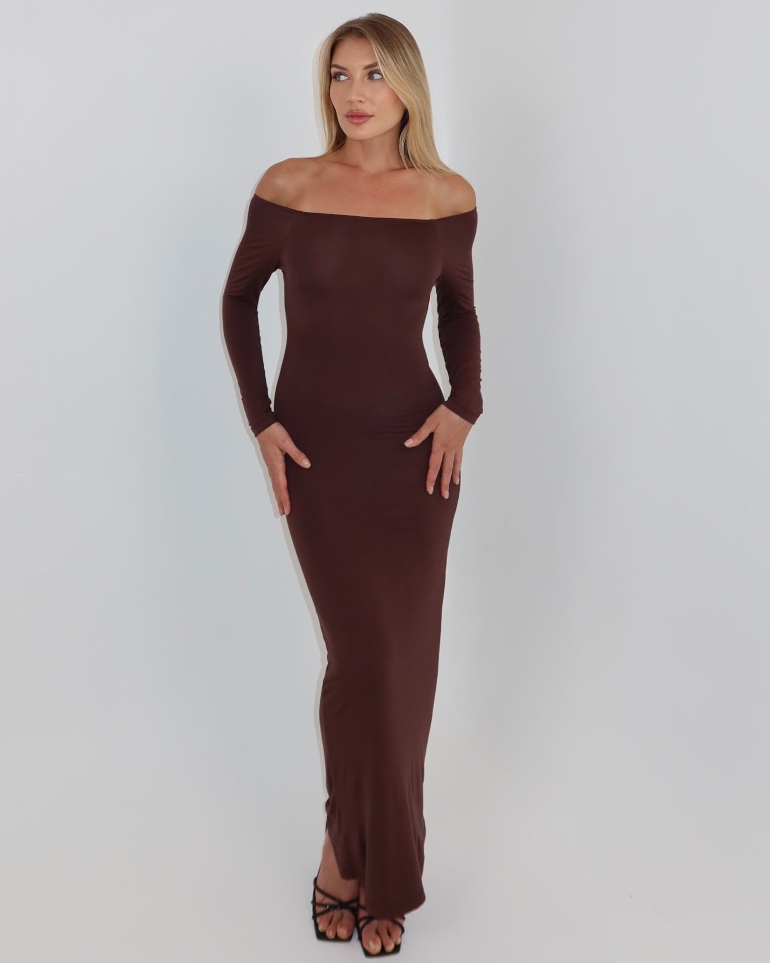 the darya luxe off-shoulder dress - sleek, feminine & made for a statement. crafted to glide along your silhouette with a clean off-shoulder neckline & fitted long sleeves. finished with the stormyy signature embroidery on the sleeve for that quiet luxury touch. perfect for evenings, events or simply when you want to own the room.