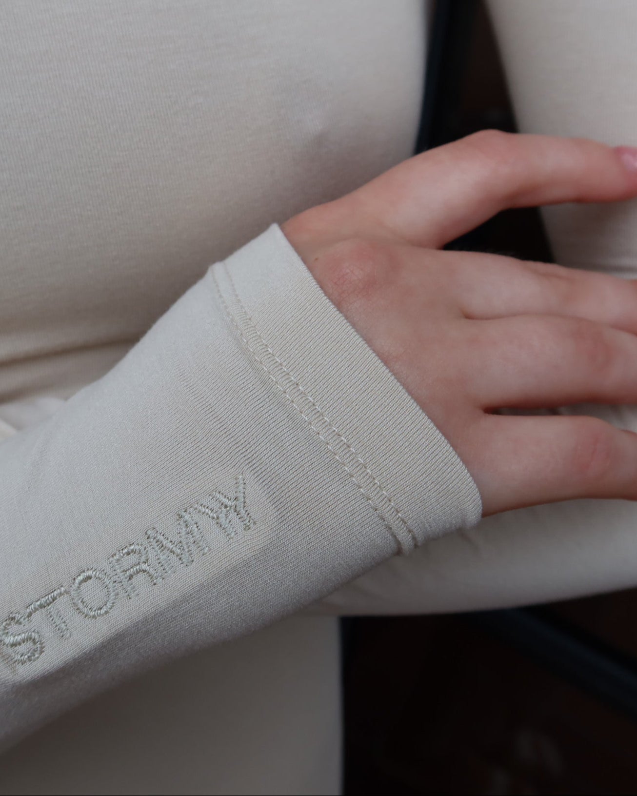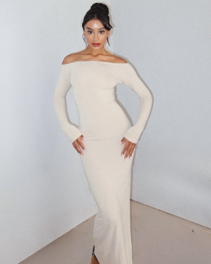 the darya luxe off-shoulder dress - sleek, feminine & made for a statement. crafted to glide along your silhouette with a clean off-shoulder neckline & fitted long sleeves. finished with the stormyy signature embroidery on the sleeve for that quiet luxury touch. perfect for evenings, events or simply when you want to own the room.