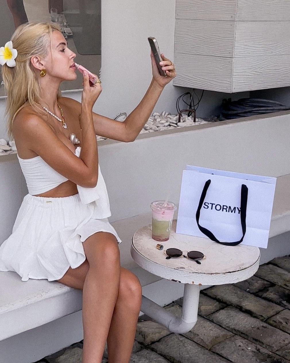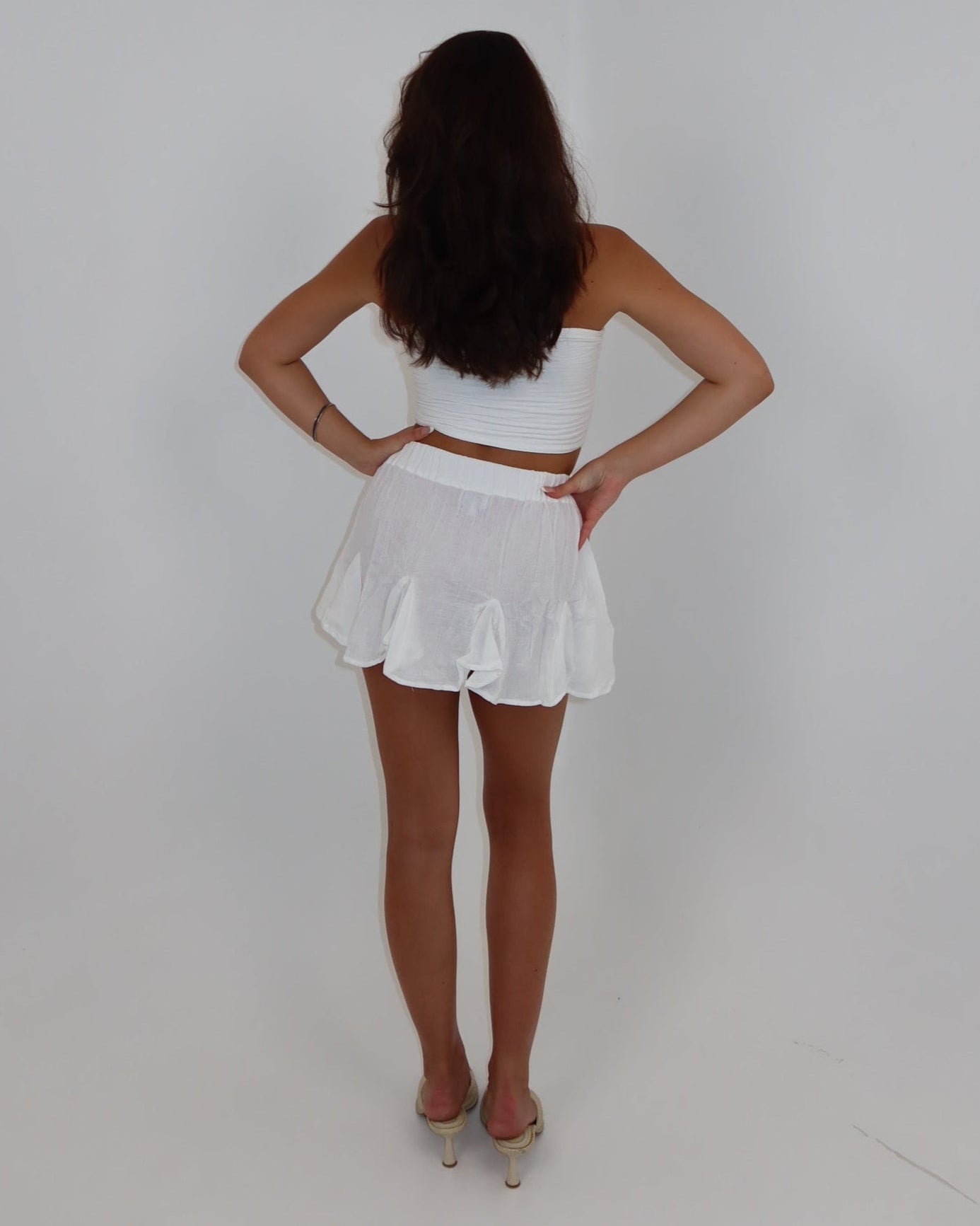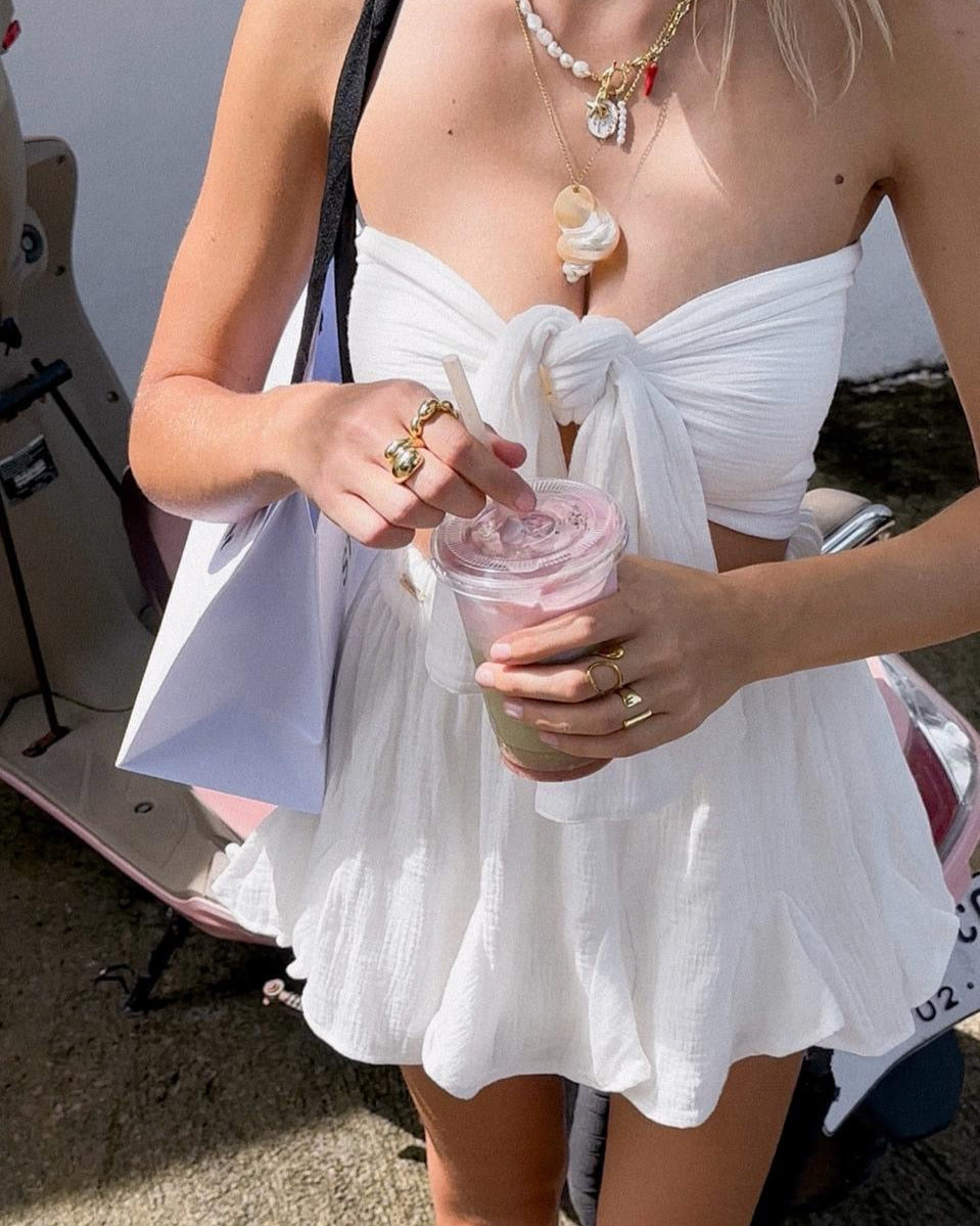 the shiva light set - breezy, feminine & made for sun-soaked days. a soft cotton bow top paired with a flirty ruffle-hem mini skirt. both pieces finished with the golden stormyy signature plate for that touch of quiet luxury.