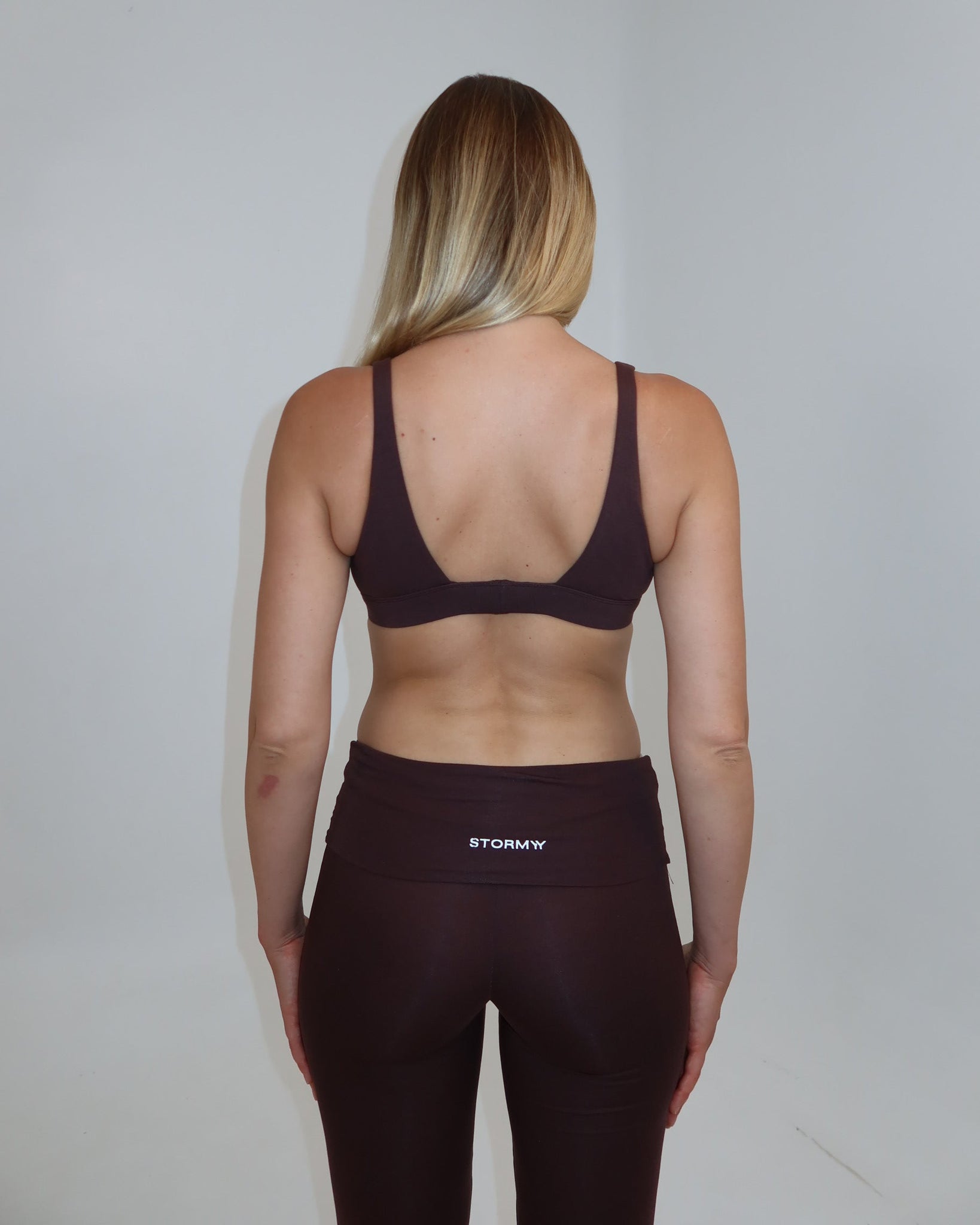 the ava soft bra - minimal, flattering & made to move with you. designed with a deep v neckline & elastic stormyy logo band under the bust. wear her solo, layered under blazers, or paired with the ava soft pants for the perfect set.