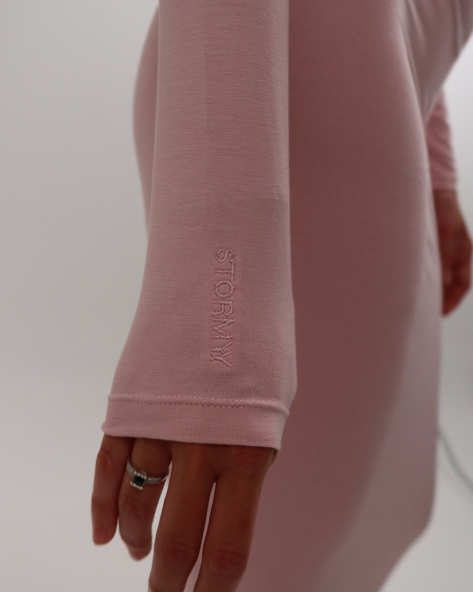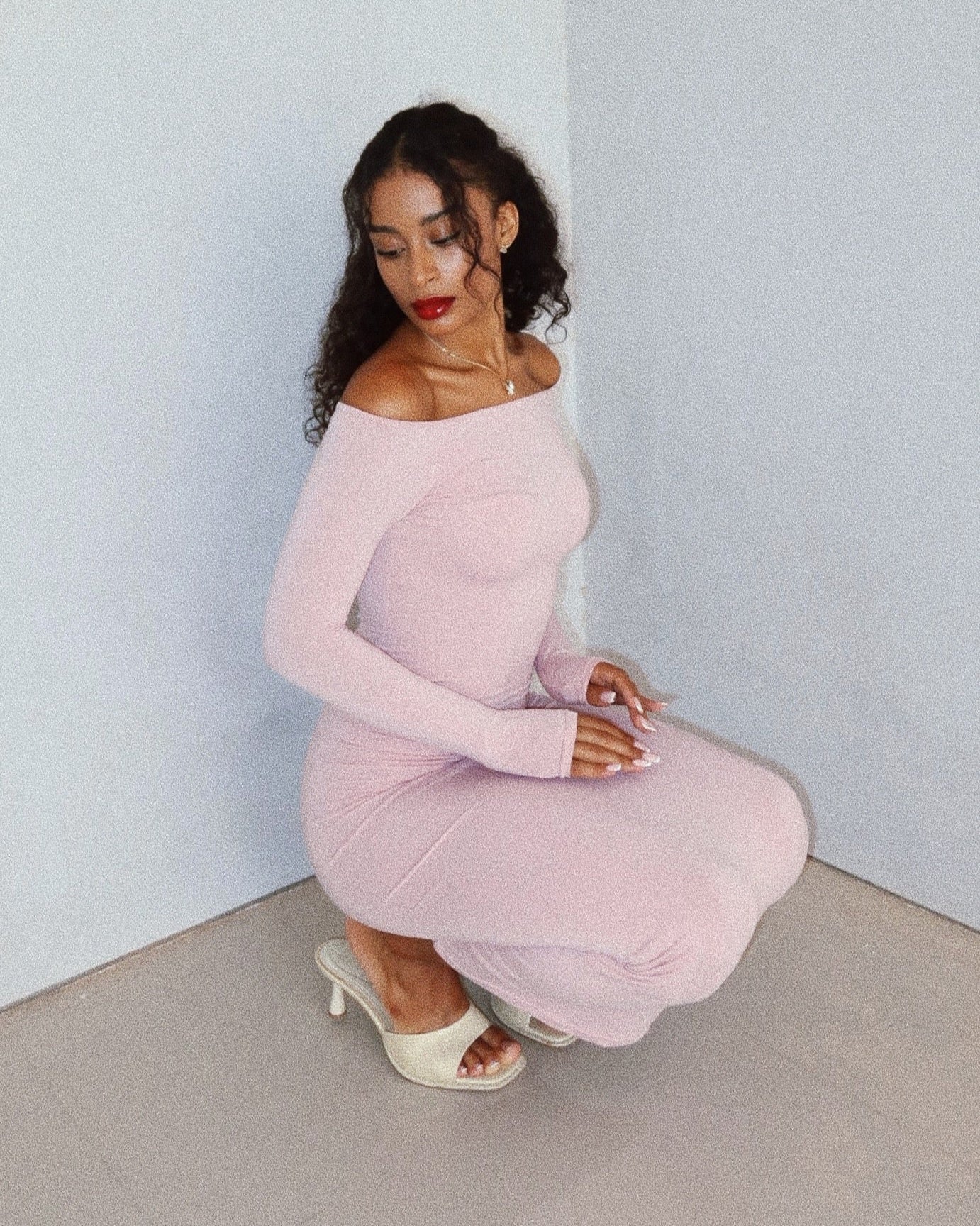 the darya luxe off-shoulder dress - sleek, feminine & made for a statement. crafted to glide along your silhouette with a clean off-shoulder neckline & fitted long sleeves. finished with the stormyy signature embroidery on the sleeve for that quiet luxury touch. perfect for evenings, events or simply when you want to own the room.